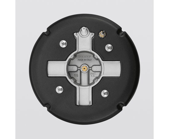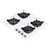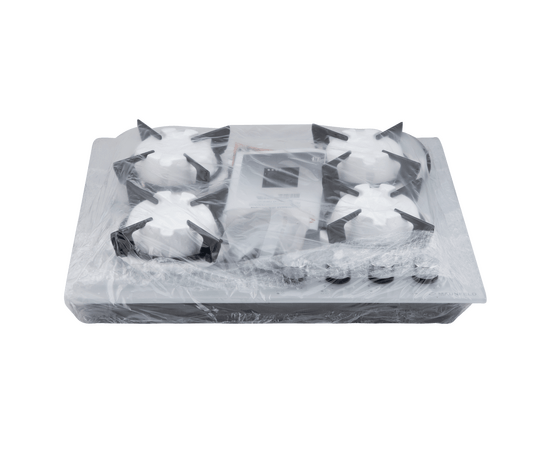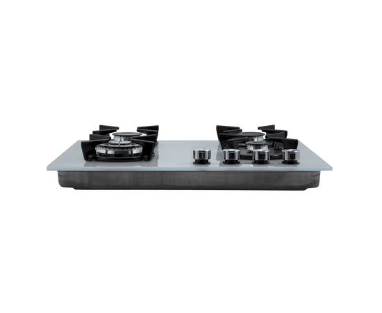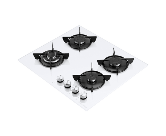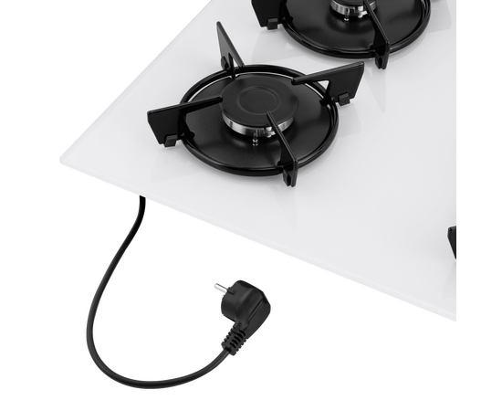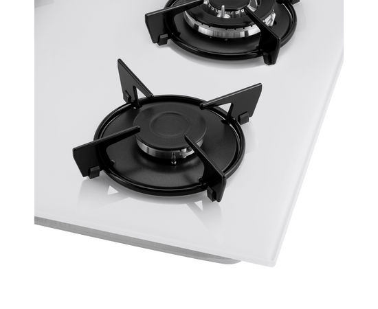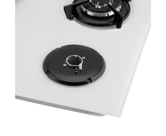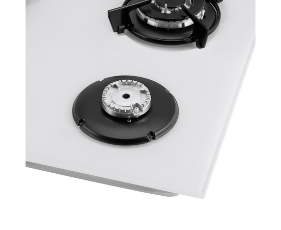 Панель выполнена из термостойкого белого стекла толщиной 8 мм немецкого концерна SCHOTT. В данной модели установлены высококачественные итальянские горелки SABAF (4 конфорки). Три стандартные конфорки разного диаметра с мощностью 1000 Вт, 1700 Вт, 1700 Вт и и одна WOK-конфорка с двойным пламенем мощностью 3000 Вт. Каждая конфорка снабжена сферической эмалированной решеткой черного цвета.