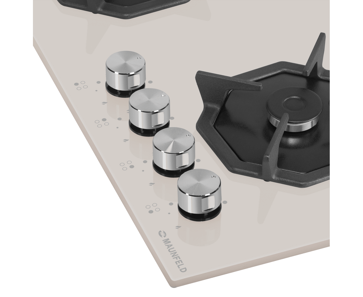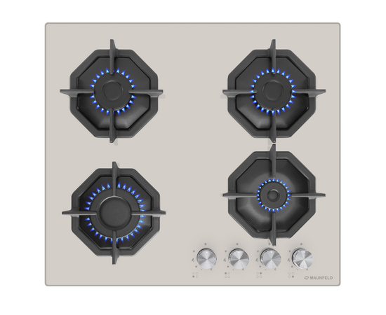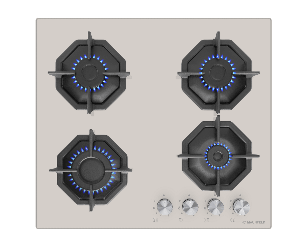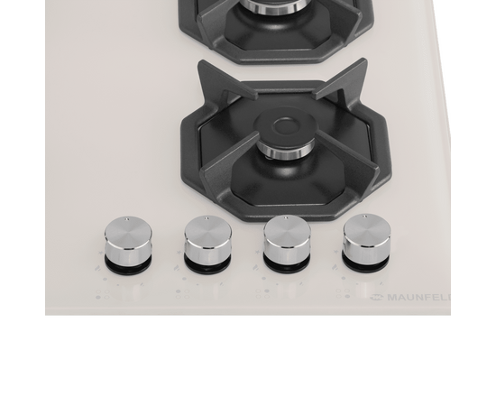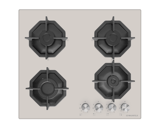Восьмиугольные чугунные подставки – это запатентованное изобретение MAUNFELD, прочные и долговечные. Сами конфорки спроектированы таким образом, что огонь не перегревает ни чугунные решетки, ни ручки управления.