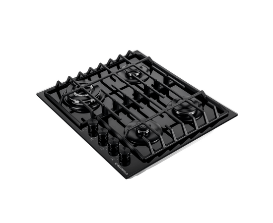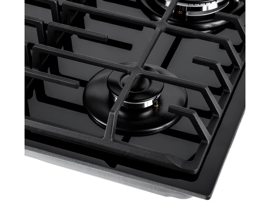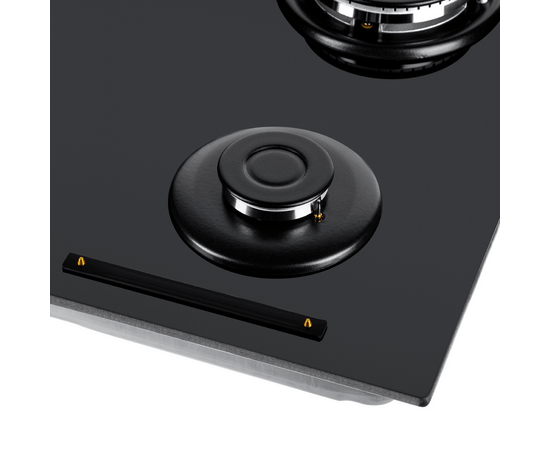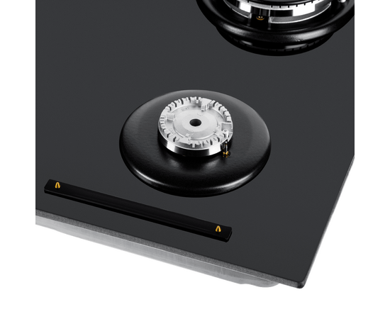 Панель выполнена из закаленного стекла черного цвета. В данной модели установлены высококачественные итальянские горелки SABAF (4 конфорки). Три стандартные конфорки мощностью 1700 Вт, 1700 Вт, 1000 Вт и одна WOK-конфорка с двойным пламенем мощностью 3800 Вт.