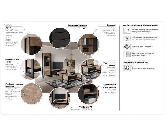 Ширина гостиной зависит от выбранных модулей. Стоимость указана за набор без подсветки. В стоимость не включен стол журнальный.