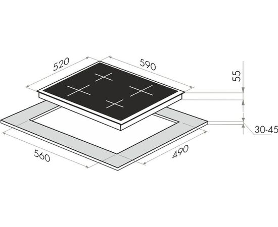 Диаметр каждой из 4-х конфорок составляет 180 мм. Мощность: 2000, 2000, 1500, 1500 Вт (из них 2 бустера 2600 Вт).