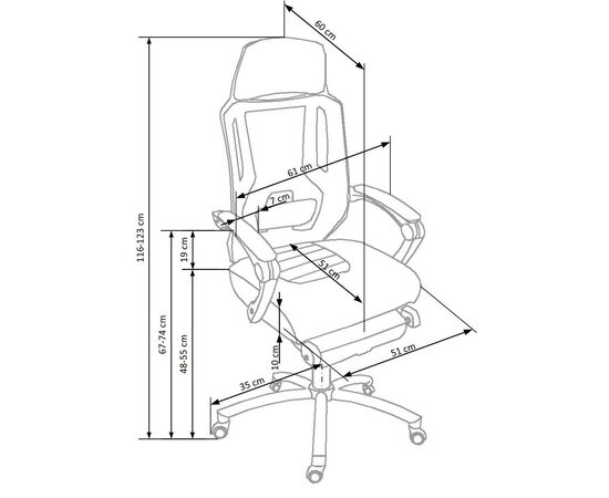 Высота кресла регулируется в диапазоне от 1160 до 1230 мм.