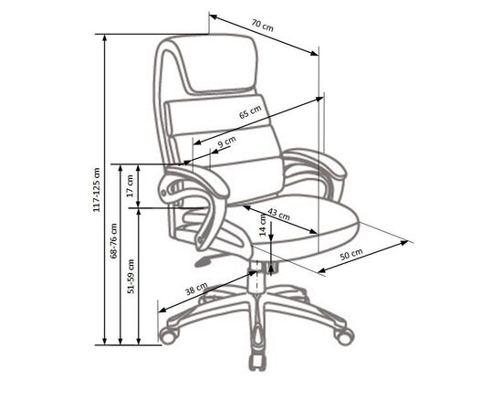 Высота кресла регулируется в диапазоне от 1170 до 1250 мм.