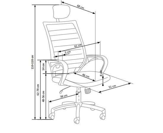 Высота кресла регулируется в диапазоне от 1100 до 1180 мм.