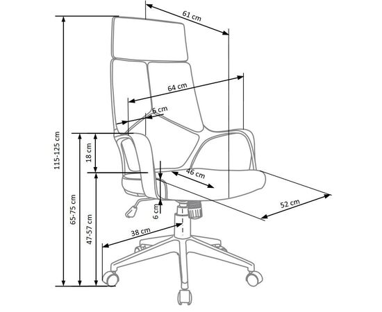 Высота кресла регулируется в диапазоне от 1150 до 1250 мм.