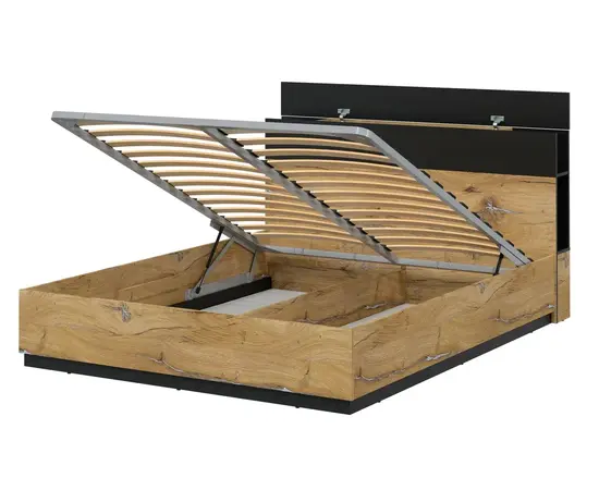 Головной щит кровати имеет открытые полки и откидную крышку с нишей для хранения. Возможна исполнение с подъемным механизмом (в комплект с подъёмным механизмом входят: подъёмники, держатели матраса и ремень для удобного подъёма основания). Стоимость указана со стационарным основанием.