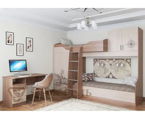 Кровать двухъярусная с ящиком Город ясень шимо светлый/темный