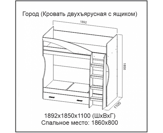 Размер спальных мест 800х1860 мм. Расцветка «Ясень Шимо темный/Ясень Шимо светлый». Первый ярус кровати комплектуется выдвижным ящиком размером 1344х600 мм на колесах.