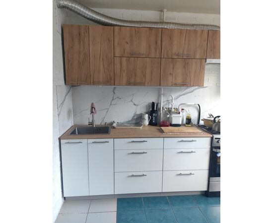 2. В данной модели кухни столешница разрезана по модулям, независимо, под какого типа мойку (накладную, врезную) и под какого типа духовку (встраиваемую, отдельностоящую) приобретается комплект. На стыки столешниц, а также на торцы, рекомендуется устанавливать металлические планки (есть в продаже).