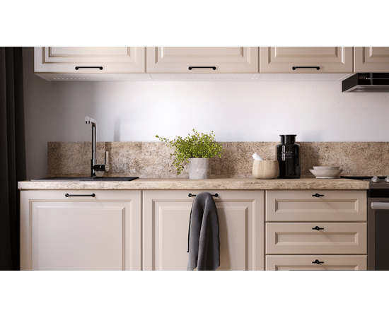 1. По умолчанию, кухонные модули комплектуются столешницей толщиной 28мм. Замена столешницы на толщину 38мм возможна за дополнительную плату.