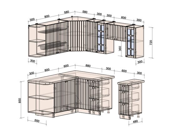 4. Для данной модели кухни предусмотрена модульная программа, что позволяет вносить изменения в стандартные готовые комплекты. Ассортимент и стоимость модулей уточняйте у менеджеров.