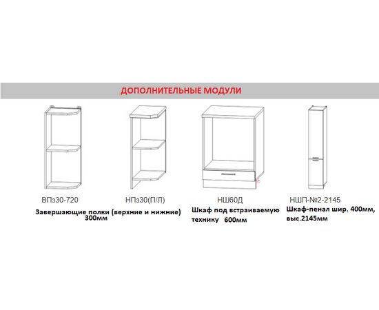 Для данной модели кухни предусмотрена модульная программа, что позволяет вносить изменения в стандартные готовые комплекты. Ассортимент и стоимость модулей уточняйте у менеджеров.