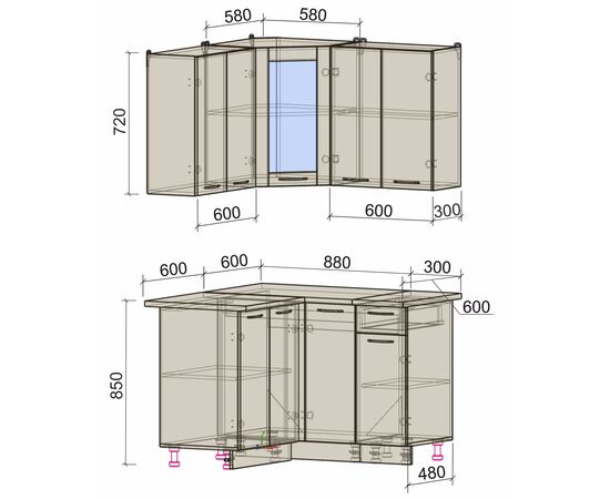 4. В данной модели кухни столешница разрезана по модулям, независимо, под какого типа мойку (накладную, врезную) и под какого типа духовку (встраиваемую, отдельностоящую) приобретается комплект. На стыки столешниц, а также на торцы, рекомендуется устанавливать металлические планки (есть в продаже).