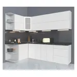 - Угловые — обладают компактными размерами, экономят пространство. Обычно шкафы и рабочая поверхность расположены линейно, а мойка – в углу.