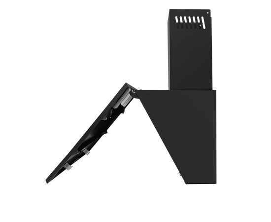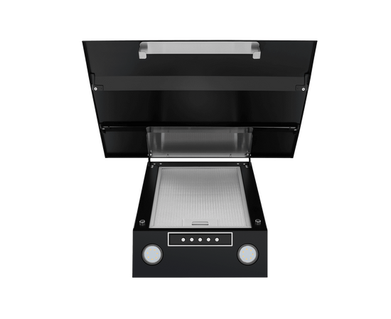 Корпус сделан из нержавеющей стали. Откидная панель, также выполненная из металла с эмалевым покрытием и вставкой из закаленного черного стекла, скрывает легко снимающийся жироулавливающий фильтр. Загрязненный воздух втягивается по периметру откидной панели.