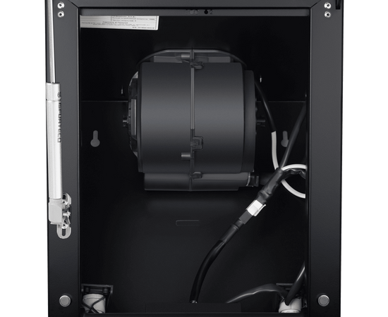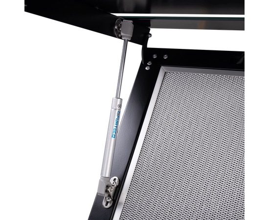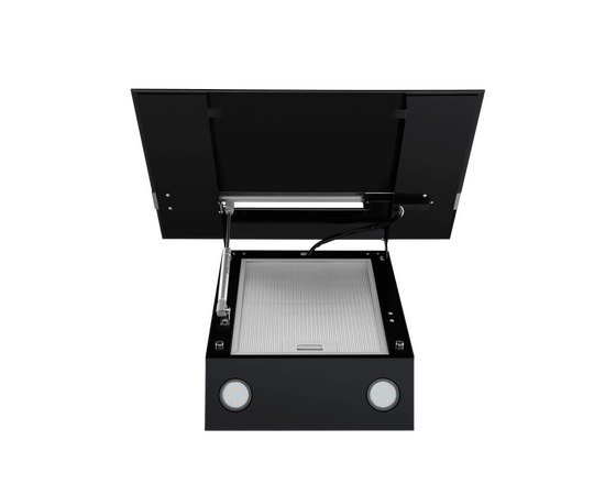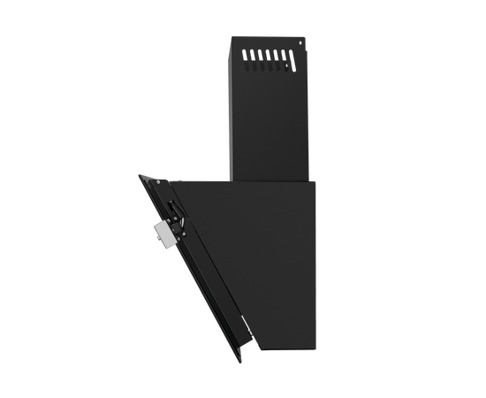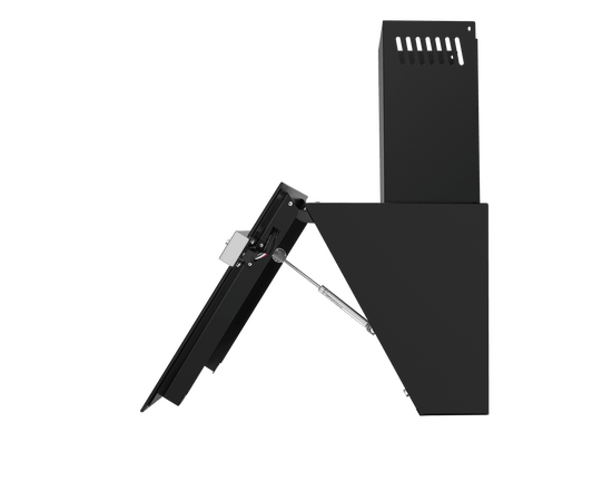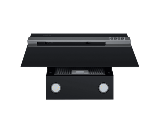 Корпус выполнен из нержавеющей стали. Откидной фасад из закаленного стекла черного цвета с металлической вставкой оснащен пневматической системой газ-лифт, позволяющей надежно фиксировать дверцу в открытом состоянии. За фасадом находится многослойный жироулавливающий фильтр, который легко вынимается и полностью разбирается, что сильно упрощает его чистку.