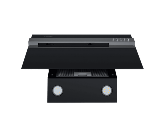 Корпус выполнен из нержавеющей стали. Откидная панель, выполненная из закаленного черного цвета с фацетом, скрывает легко снимающийся алюминиевый жироулавливающий фильтр. Загрязненный воздух втягивается по периметру всей откидной панели.