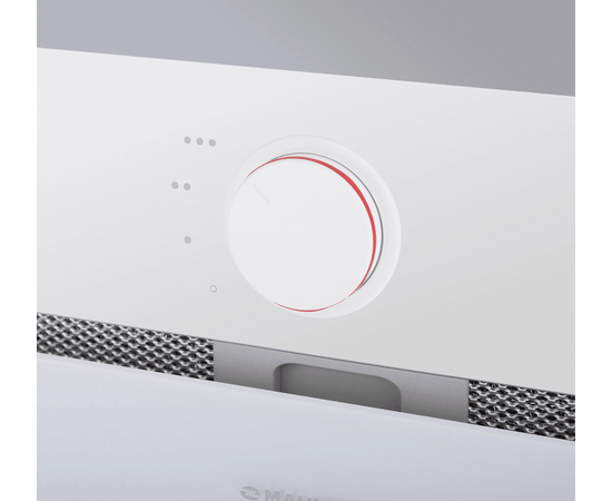 Выбор одного из 3-х режимов работы вытяжки осуществляется с помощью поворотного переключателя белого цвета с красной полосой. Нажав на переключатель как на кнопку, вы включаете освещение (2 светодиодных светильника по 3 Вт каждый).