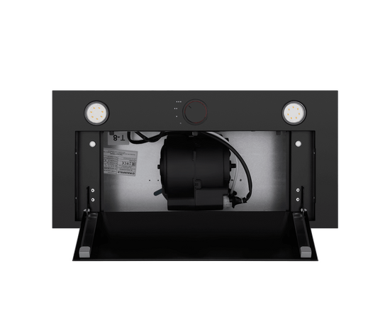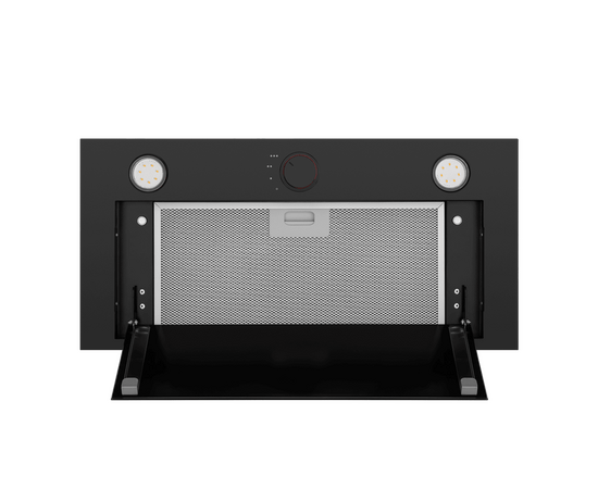 Корпус и фасад сделаны из нержавеющей стали с высококачественным покрытием. Откидная панель из глянцевого закаленного стекла фиксируется на магнитных защелках. За ней располагается легко снимающийся жироулавливающий алюминиевый фильтр. Загрязненный воздух втягивается по периметру откидной панели.