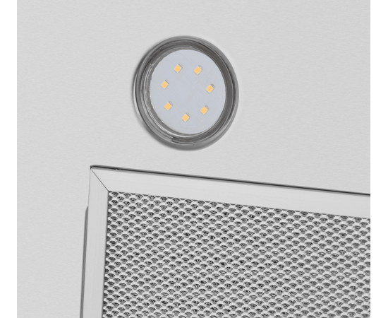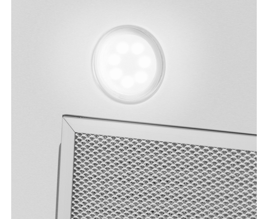 Кнопочная система управления вытяжки позволяет выбрать один их 3-х режимов работы и включить подсветку. Освещение рабочей поверхности обеспечивается 2-мя мощными светодиодными светильниками (3 Вт).