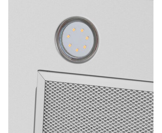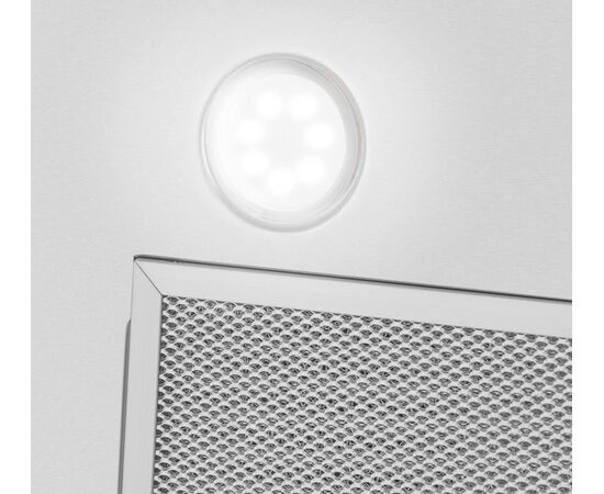 Эргономичное кнопочное управление вытяжки позволяет выбрать одну из 3-х скоростей вентилятора – две стандартные или турбо, а также включить освещение (2 светодиодных элемента по 3 Вт каждый).