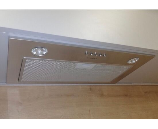 Корпус выполнен из нержавеющей стали. На фронтальной панели бежевого цвета установлен многослойный жироулавливающий алюминиевый фильтр. Он легко вынимается из вытяжки и полностью разбирается, что значительно упрощает его очистку.