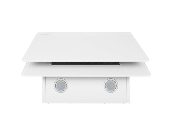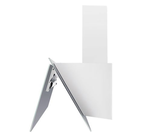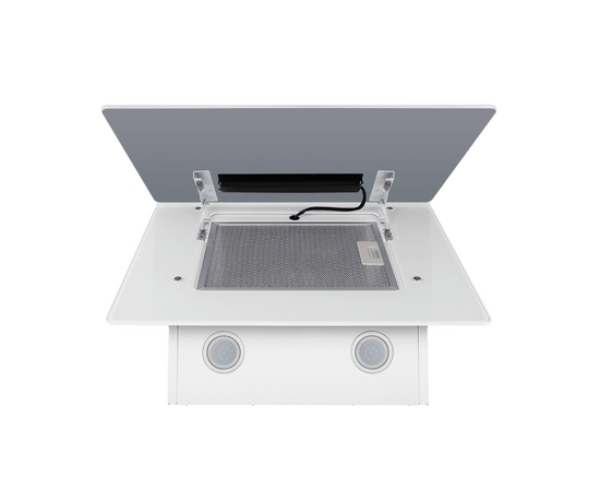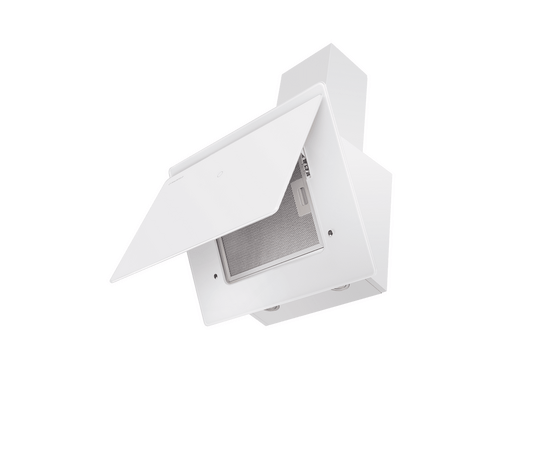 Корпус выполнен из нержавеющей стали. Фронтальная часть состоит из 2-х панелей из глянцевого закаленного стекла белого цвета. Они легко очищаются и долго сохраняют свой первозданный вид. За передней откидной панелью скрыт легко снимающийся металлический жироулавливающий фильтр. Загрязненный воздух втягивается по периметру откидной панели.