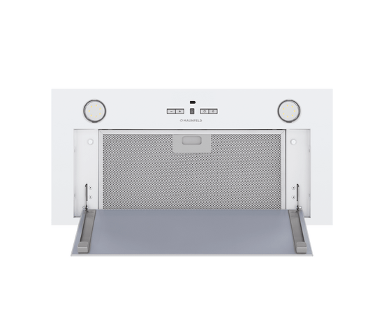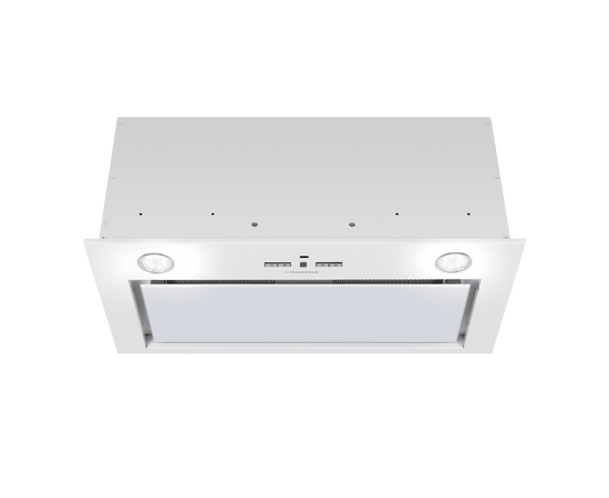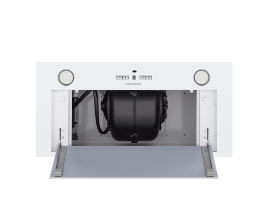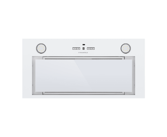 Корпус сделан из нержавеющей стали. Матовый фасад прекрасно сочетается с откидной панелью из закаленного глянцевого стекла белого цвета. За ней располагается металлический жироулавливающий фильтр, который легко снимается и полностью разбирается для чистки. Загрязненный воздух втягивается по всему периметру панели.