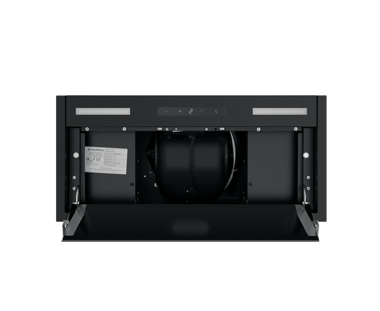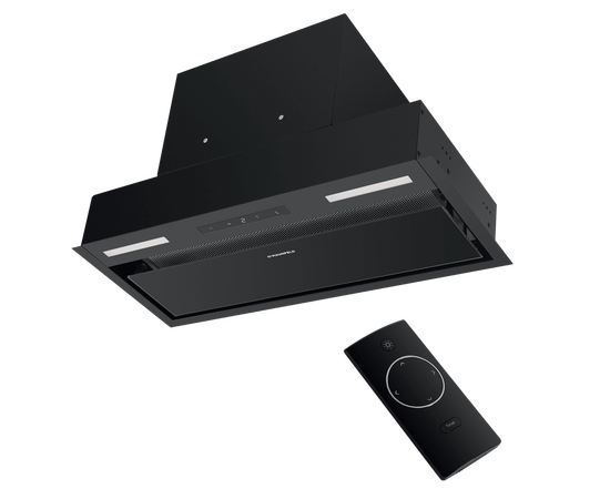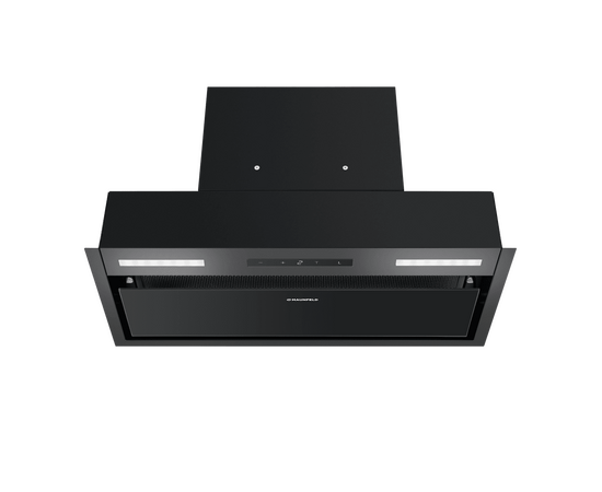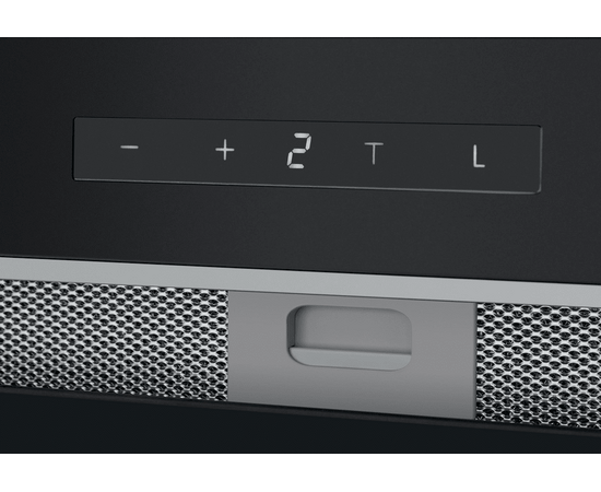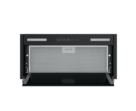 Корпус сделан из нержавеющей стали. На фасаде вытяжки черного цвета находится откидная панель, выполненная из закаленного стекла. За ней располагается легко снимающийся жироулавливающий алюминиевый фильтр. Загрязненный воздух втягивается по всему периметру панели.