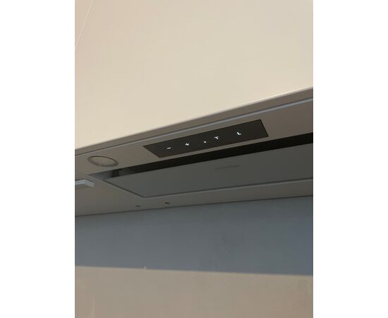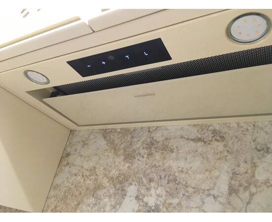 Корпус вытяжки бежевого цвета сделан из нержавеющей стали. На фасаде находится откидная панель, выполненная из закаленного стекла в цвет корпуса. За ней располагается легко снимающийся жироулавливающий алюминиевый фильтр. Загрязненный воздух втягивается по периметру откидной панели.