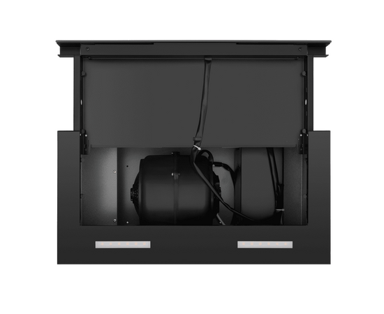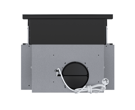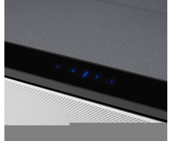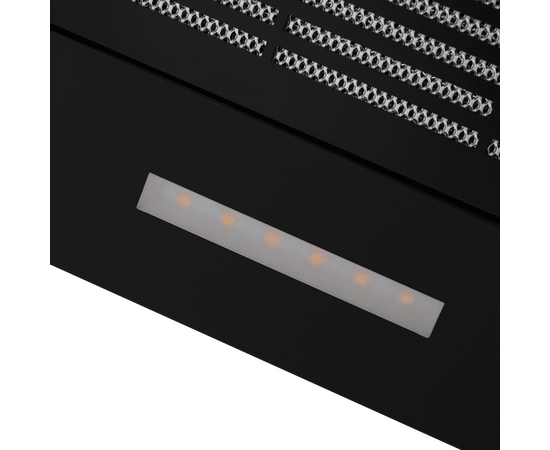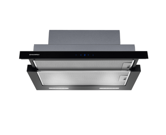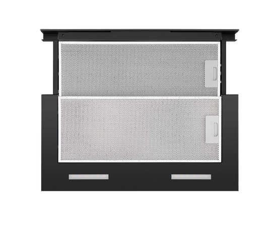 Фасад выдвижной панели выполнен из закаленного глянцевого стекла черного цвета. Основная рабочая и выдвижная панели изготовлены из нержавеющей стали с эмалированным черным покрытием. Предусмотрено два жироулавливающих фильтра из алюминия, которые легко снимаются и полностью разбираются для чистки.