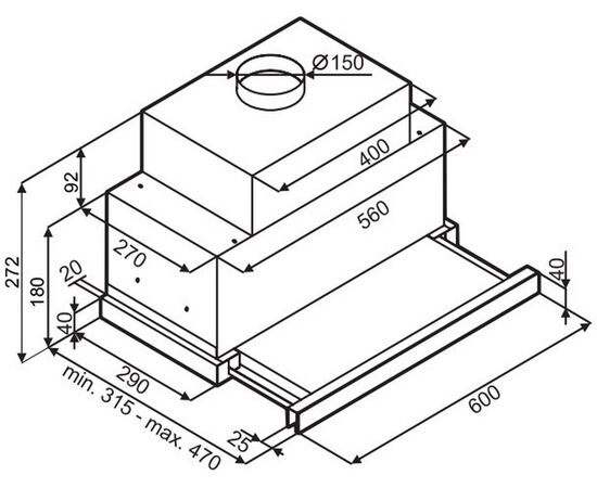 Сверхмощная телескопическая кухонная вытяжка с шириной 60 см благодаря выдвижному козырьку может эффективно очищать загрязненный воздух на в кухне очень большой площади (до 50 кв.м). Модель встраивается в навесной шкаф над поверхностью плиты. Работает в 2-х режимах – отвода (при подключении вытяжки к системе вентиляции) и рециркуляции (при использовании сменного угольного фильтра в вытяжке).