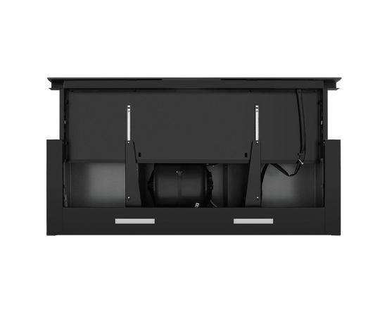Фасад выдвижной панели выполнен из закаленного глянцевого стекла черного цвета. Основная рабочая и выдвижная панель изготовлены из нержавеющей стали с эмалированным черным покрытием. Откидные панели на них, также черного цвета, сделаны с вентиляционными прорезями и скрывают за собой 2 легко вынимаемых многослойных алюминиевых жироулавливающих фильтра. Корпус сделан из нержавеющей стали.