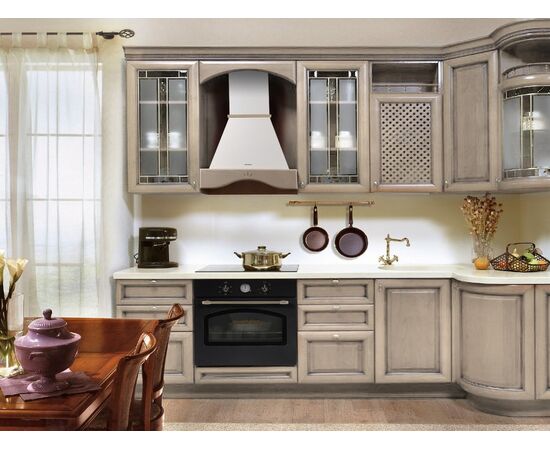 Корпус сделан из нержавеющей стали, покрытой прочной эмалью благородного бежевого цвета. Обрамление рабочей зоны выполнено из неокрашенного натурального дерева. Многослойный жироулавливающий фильтр из алюминия легко вынимается и полностью разбирается, что сильно упрощает его чистку.