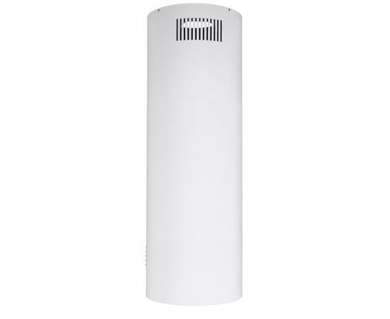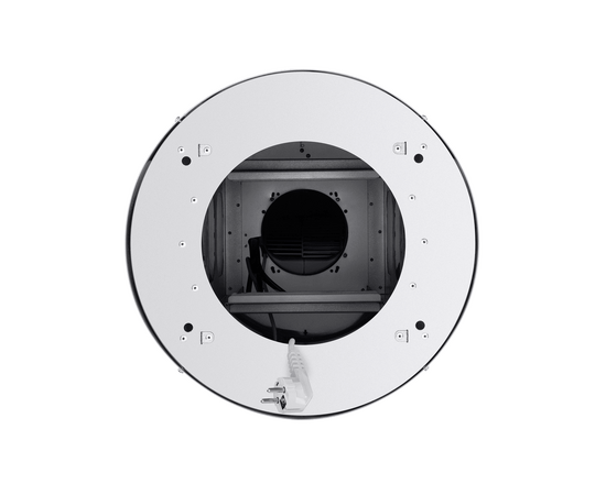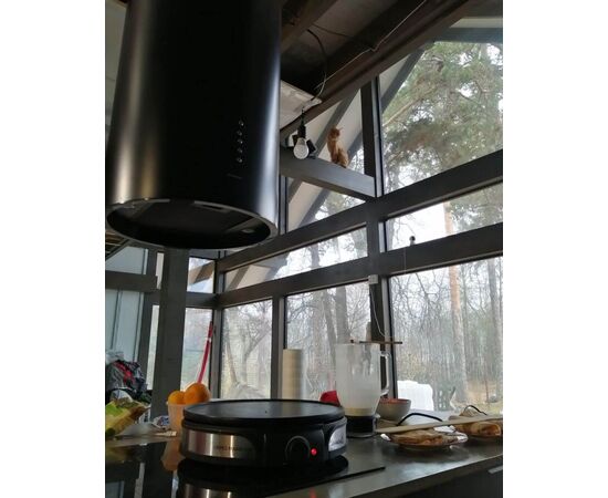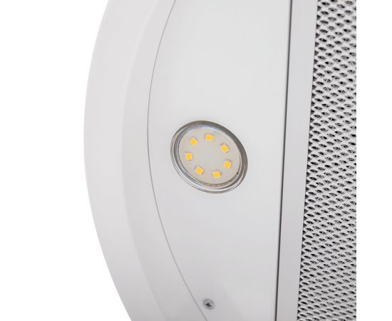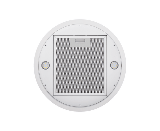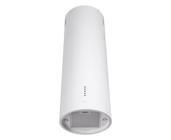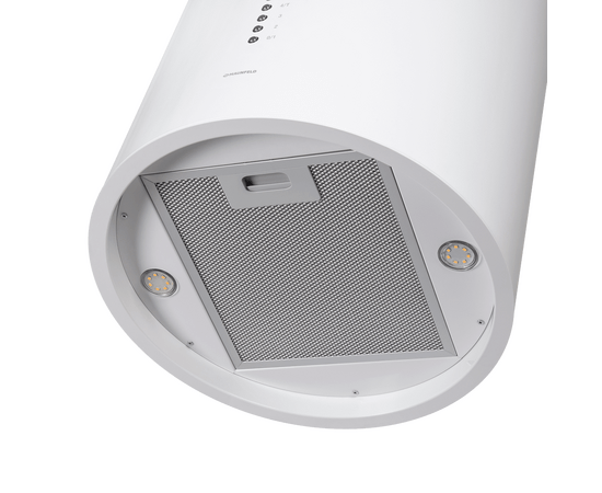 Корпус цилиндрической формы, выполненный из нержавеющей стали с термостойким покрытием белого цвета, крепится на потолок над поверхностью плиты. В нижней части вытяжки находится алюминиевый многослойный жироулавливающий фильтр. Он легко вынимается и полностью разбирается, что сильно упрощает чистку.