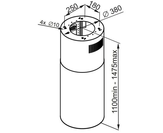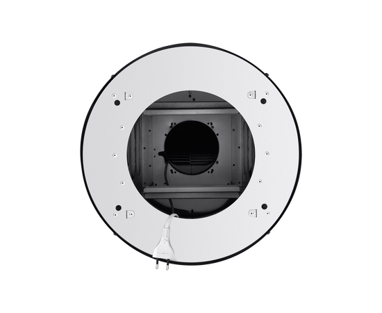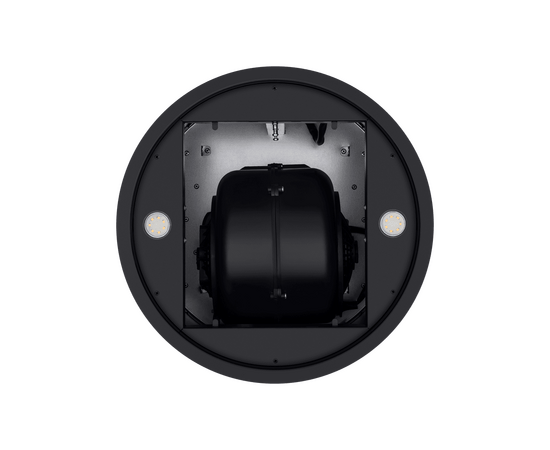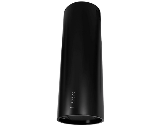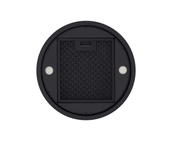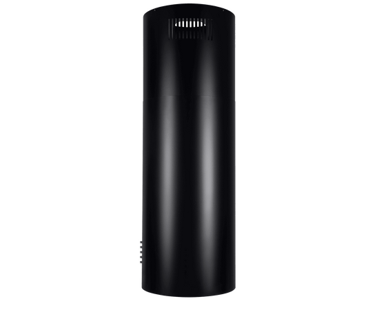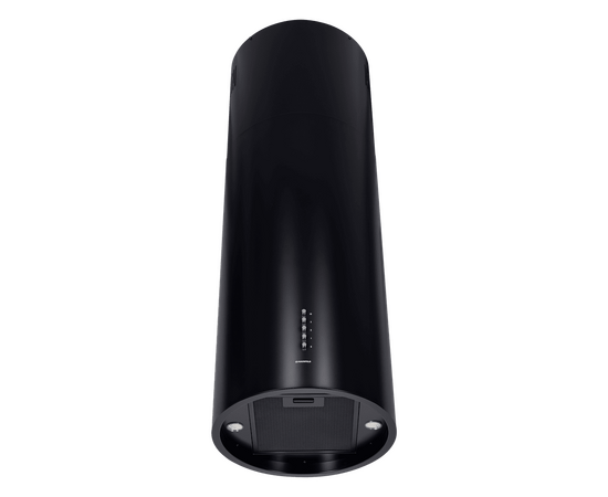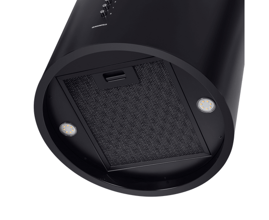 Корпус цилиндрической формы, выполненный из нержавеющей стали с термостойким покрытием черного цвета, монтируется на потолок над варочной поверхностью. В нижнем торце вытяжки расположен специальный многослойный жироулавливающий фильтр, который легко вынимается и полностью разбирается для чистки.
