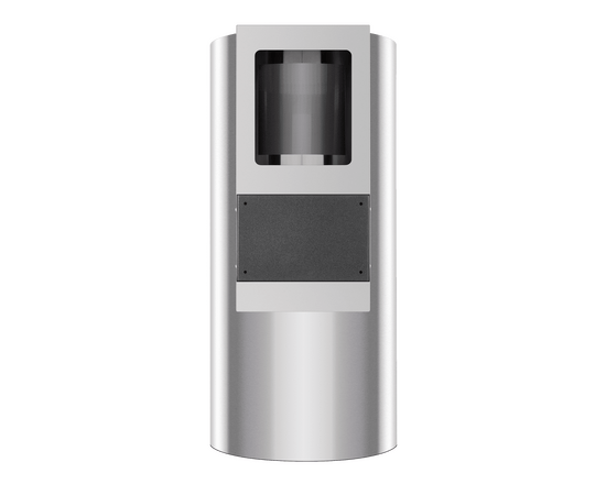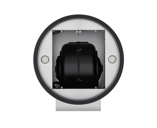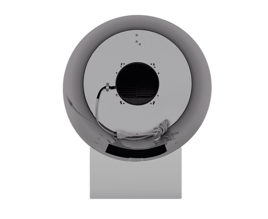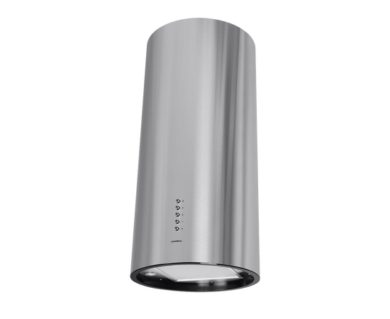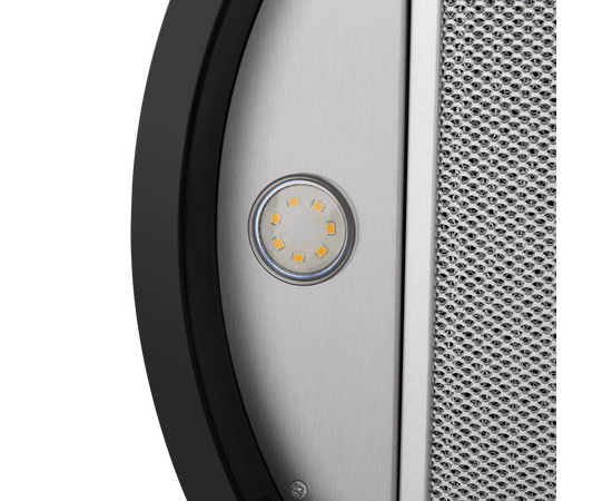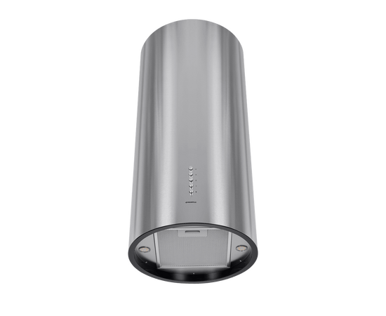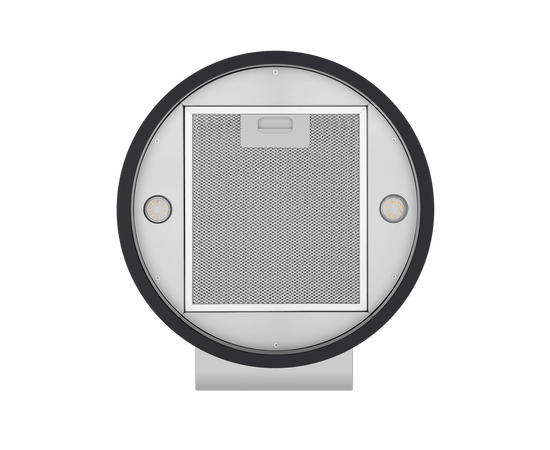 Корпус цилиндрической формы, выполненный из нержавеющей стали с термостойким покрытием черного цвета, монтируется на стене над варочной поверхностью. В нижнем торце вытяжки расположен специальный многослойный жироулавливающий фильтр черного цвета.