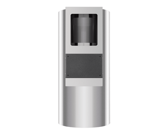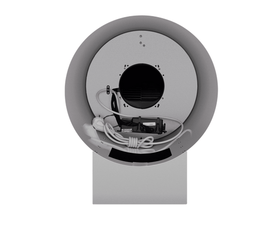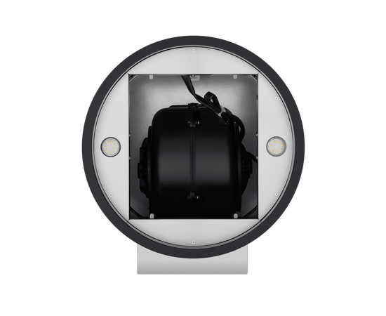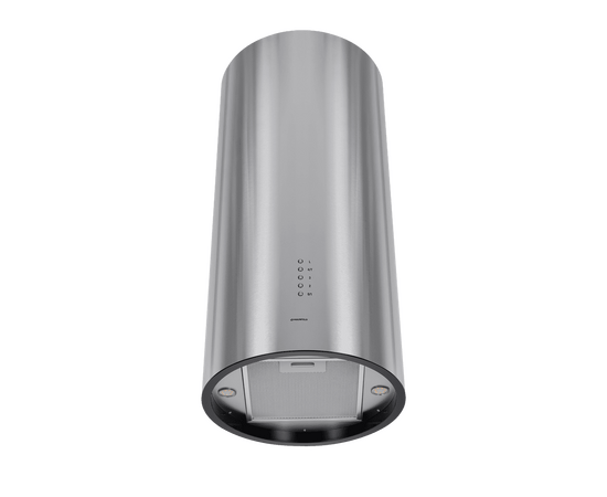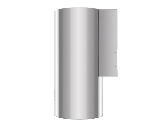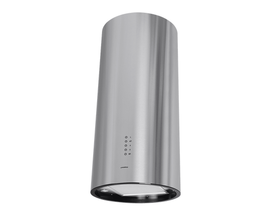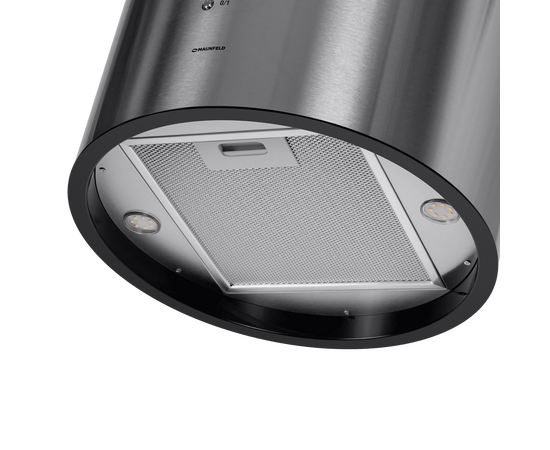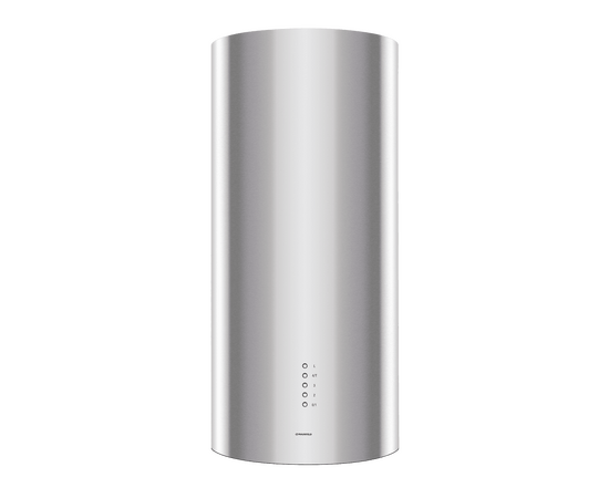 Корпус цилиндрической формы, сделанный из нержавеющей стали с термостойким покрытием, монтируется на стену над варочной поверхностью. Нижний торец вытяжки выполнен в черном акцентном цвете. Специальный многослойный жироулавливающий фильтр легко снимается и полностью разбирается, что сильно упрощает его чистку.