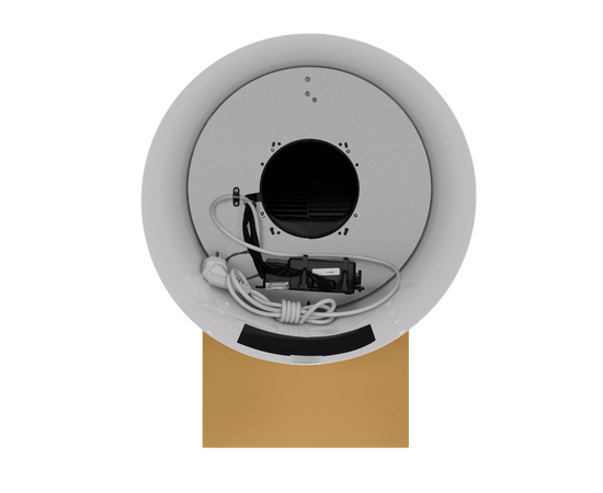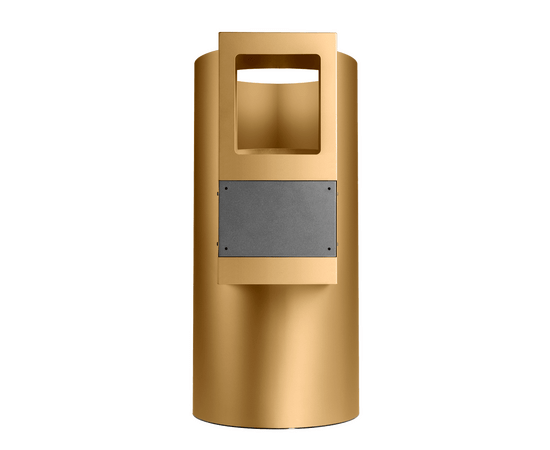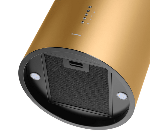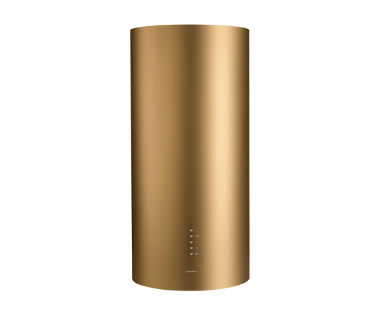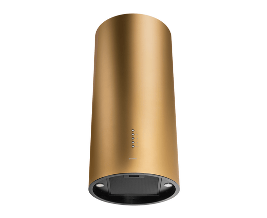 Корпус цилиндрической формы, сделанный из нержавеющей стали с термостойким покрытием цвета матового золота, монтируется на стену над варочной поверхностью. Нижний торец вытяжки выполнен в черном акцентном цвете. Специальный многослойный жироулавливающий фильтр легко снимается и полностью разбирается, что сильно упрощает его чистку.