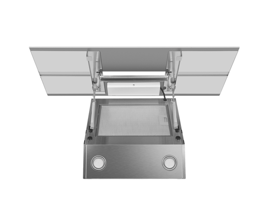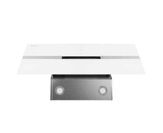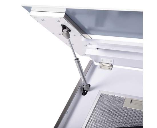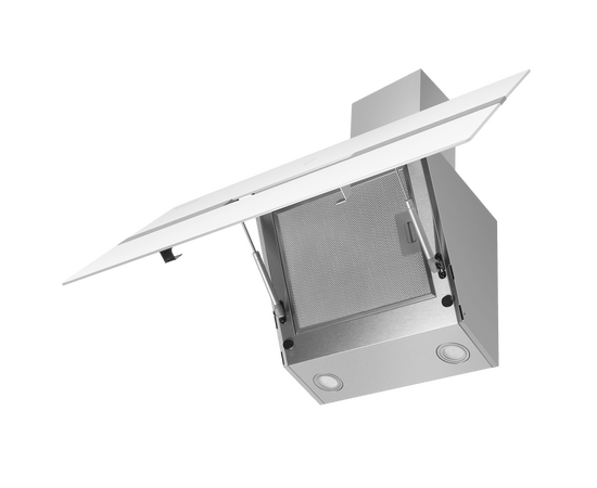 Корпус выполнен из матированной нержавеющей стали. Откидной фасад из закаленного глянцевого стекла белого цвета украшен стальными вставками. Загрязненный воздух втягивается по всему периметру панели через алюминиевый жироулавливающий фильтр, который легко снимается и полностью разбирается, что сильно упрощает его чистку. Особое внимание заслуживает система фиксации откидной панели - это газ-лифты и магнитные защелки.