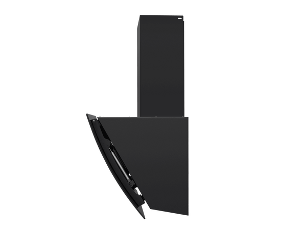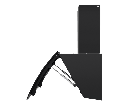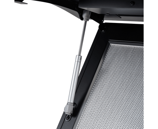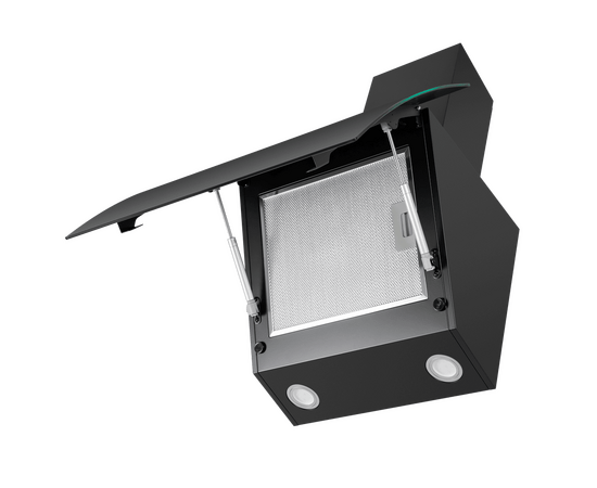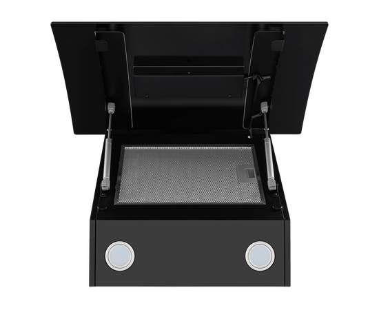 Корпус выполнен из нержавеющей стали с высококачественным эмалированным покрытием. Откидная фронтальная панель имеет оригинальную изогнутую форму, которая особенно удачно выглядит в исполнении из глянцевого стекла. За ней скрыт алюминиевый легко снимающийся жироулавливающий фильтр. Особое внимание заслуживает система фиксации - это газ-лифты и магнитные защелки панели.