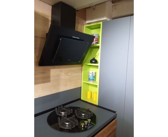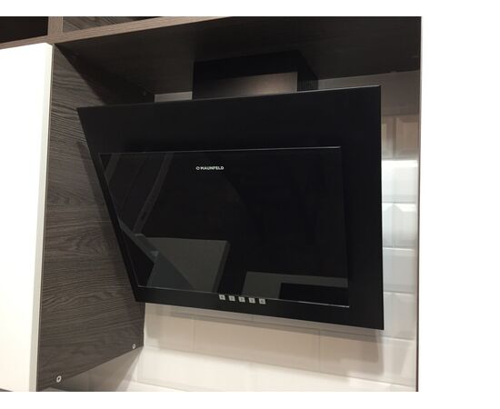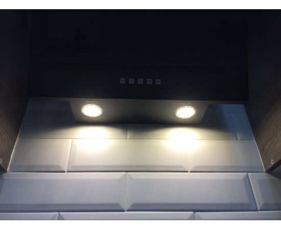 Наклонная вытяжка черного цвета шириной 60 см прекрасно подойдет для кухни площадью до 20 кв.м. Крепится к стене над варочной поверхностью. Работает в двух режимах: отвода (при подключении вытяжки к системе вентиляции) и рециркуляции (при использовании сменного угольного фильтра в вытяжке).