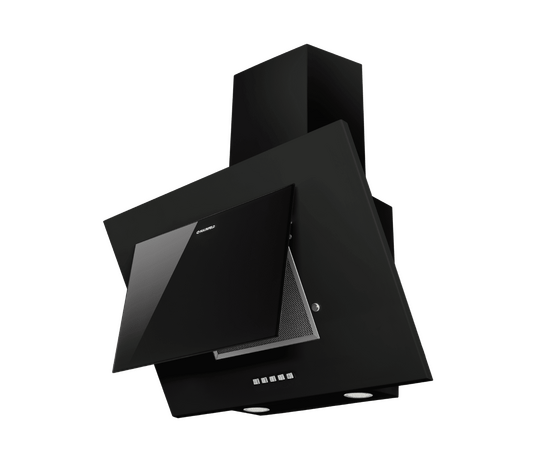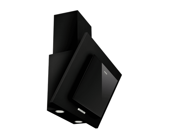 Наклонная вытяжка черного цвета шириной 60 см прекрасно подойдет для кухни площадью до 20 кв.м. Крепится к стене над варочной поверхностью. Работает в двух режимах: отвода (при подключении вытяжки к системе вентиляции) и рециркуляции (при использовании сменного угольного фильтра в вытяжке).