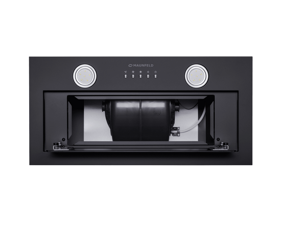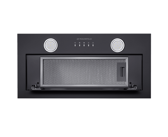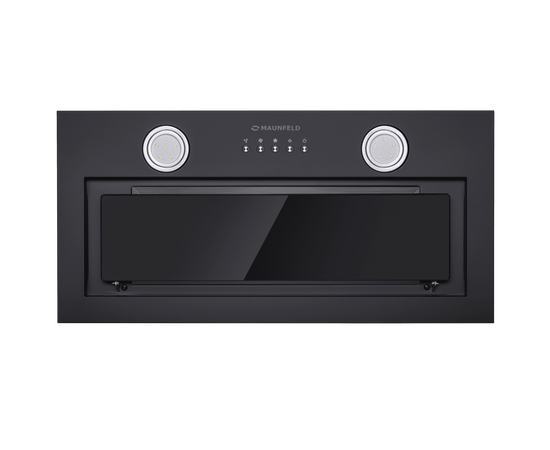 Фронтальная панель выполнена из нержавеющей стали с высококачественным покрытием черного цвета. За откидной панелью из глянцевого закаленного стекла находится многослойный жироулавливающий фильтр, который легко вынимается и полностью разбирается, что сильно упрощает чистку.