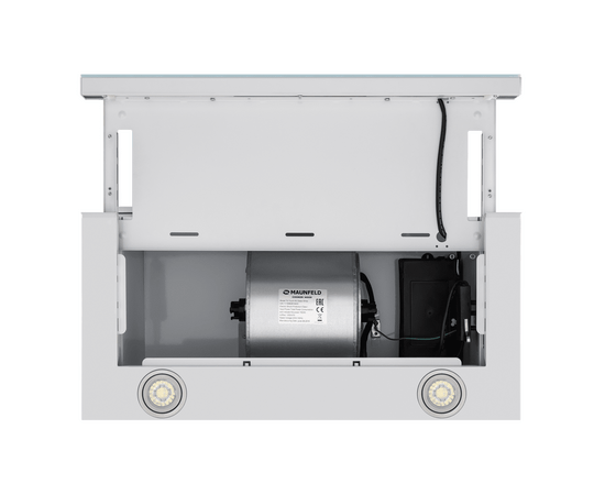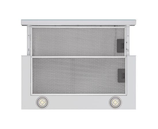 Корпус сделан из нержавеющей стали с термостойким покрытием белого цвета. Фасад выдвижной панели из высокопрочного закаленного стекла выполнен в цвет корпуса. Два многослойных жироулавливающих фильтра из алюминия легко вынимаются из вытяжки и полностью разбираются, что сильно упрощает их чистку.
