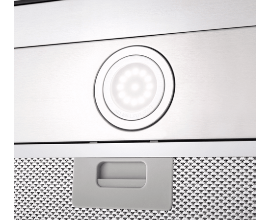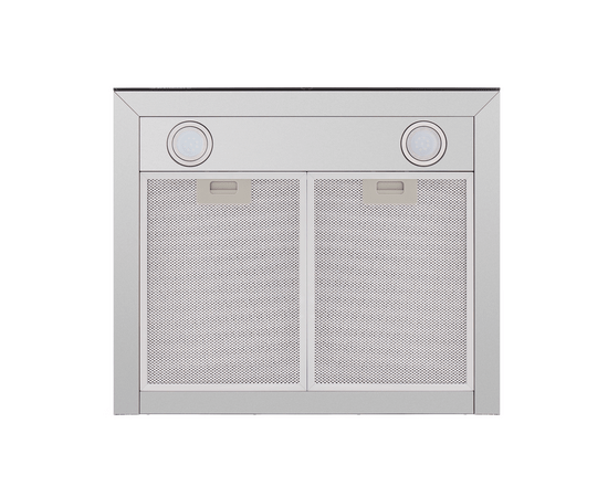Вытяжка выполнена полностью из матированной нержавеющей стали. На рабочей поверхности расположено 2 многослойных жироулавливающих алюминиевых фильтра, которые легко вынимаются и полностью разбираются, что сильно упрощает чистку.