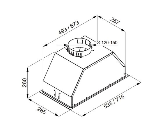 Компактная встраиваемая кухонная вытяжка шириной 54 см идеально подходит для кухни очень большой площади (50 кв.м). Модель встраивается в навесной шкаф над поверхностью плиты. Работает в двух режимах – отвода (при подключении вытяжки к системе вентиляции) и рециркуляции (при использовании сменного угольного фильтра в вытяжке)