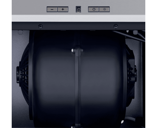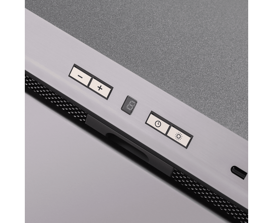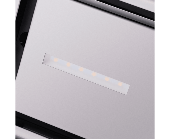 Электронное управление с дисплеем располагается на фасаде. Вы можете выбрать одну из 4-х скоростей вентилятора, включить таймер и свет. Особенность системы освещения данной модели – это расположение двух мощных светодиодных источников (3 Вт) на центральной оси откидной панели, что позволяет равномерно освещать зону готовки.