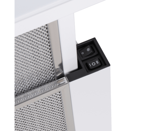 Управление вытяжкой осуществляется двумя клавишными переключателями, расположенных между панелями. Вы можете выбрать одну из 2-х скоростей вентилятора и включить освещение (2 светодиодных источника по 1 Вт).