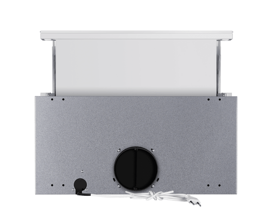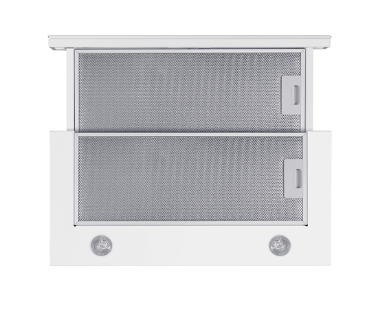 Фасад выдвижной панели выполнен из закаленного стекла белого цвета. При желании вы можете поменять его на фасад любого другого цвета из нашей линейки. Корпус сделан из матированной нержавеющей стали. Два многослойных жироулавливающих фильтра из алюминия легко вынимаются из вытяжки и полностью разбираются, что сильно упрощает их чистку.